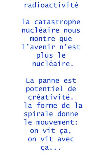 Descriptif : La catastrophe nucléaire engendre des pannes et des potentiels pour la créativité d’une nouvelle société. Les dessins, estampes et textes pris dans des journaux font l’objet d’un livre d’artiste.